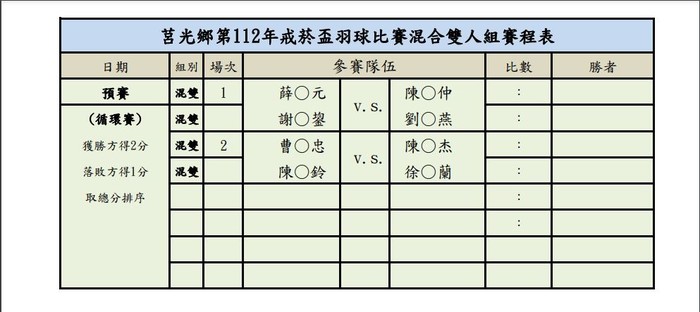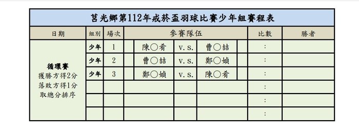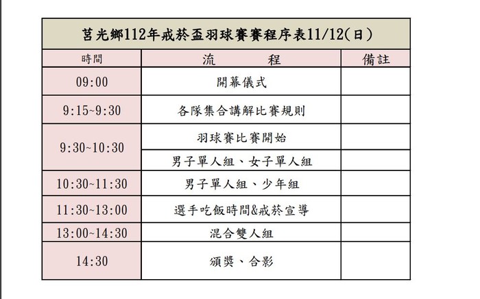 112年戒菸盃羽球賽預訂於112年11月12日(星期日)辦理,請各隊參賽隊員於11月12日上午9點00分於東莒國小集合,凡參加選手即提供餐點乙份,歡迎鄉親到場為球員加油打氣。如因氣候因素延期舉行,將另行公告。