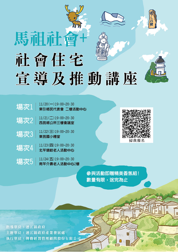 將在連江縣四鄉五島中,各辦理一場社會住宅宣導及推動講座。邀請TACC台中市建築師公會王重詔理事擔任講師,分享社會住宅相關政策,只租不售的特點,資源循環利用及共好的精神等等。