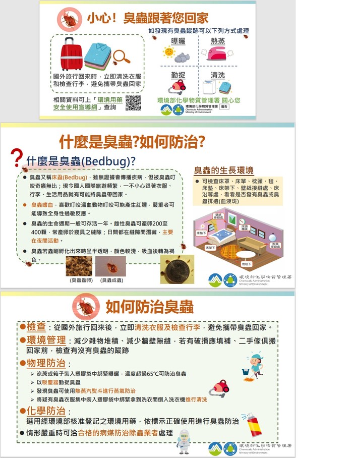 近來許多國家遭受臭蟲的侵擾,由於國際旅遊往返頻繁,相關宣導資訊置於環境用藥安全使用宣導網(網址:https://topic.moenv.gov.tw/evsu/cp-281-10605-dc5fd-8.html)及連江縣環境資源局關心您。