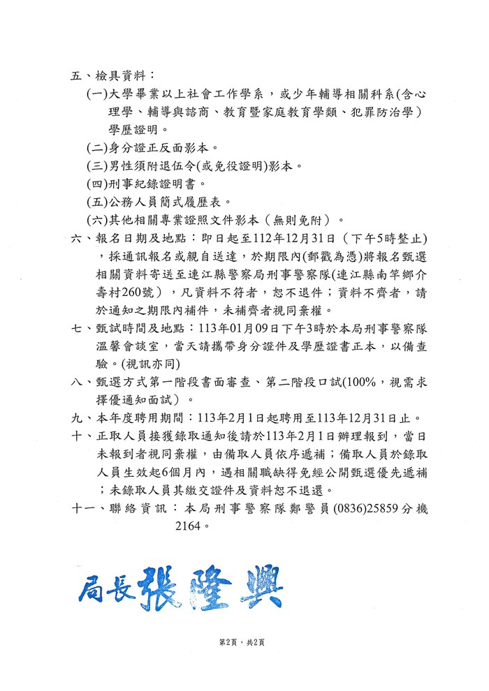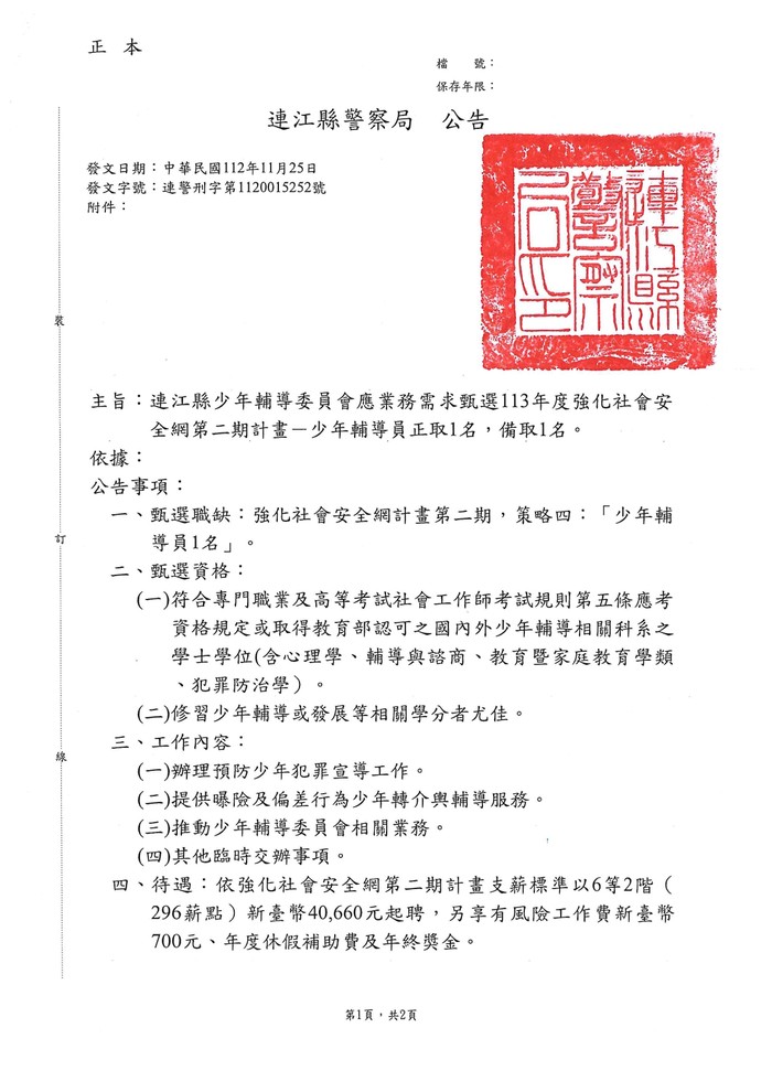 連江縣警察局甄選113年度強化社會安全網第二期計畫—少年輔導員1名公告