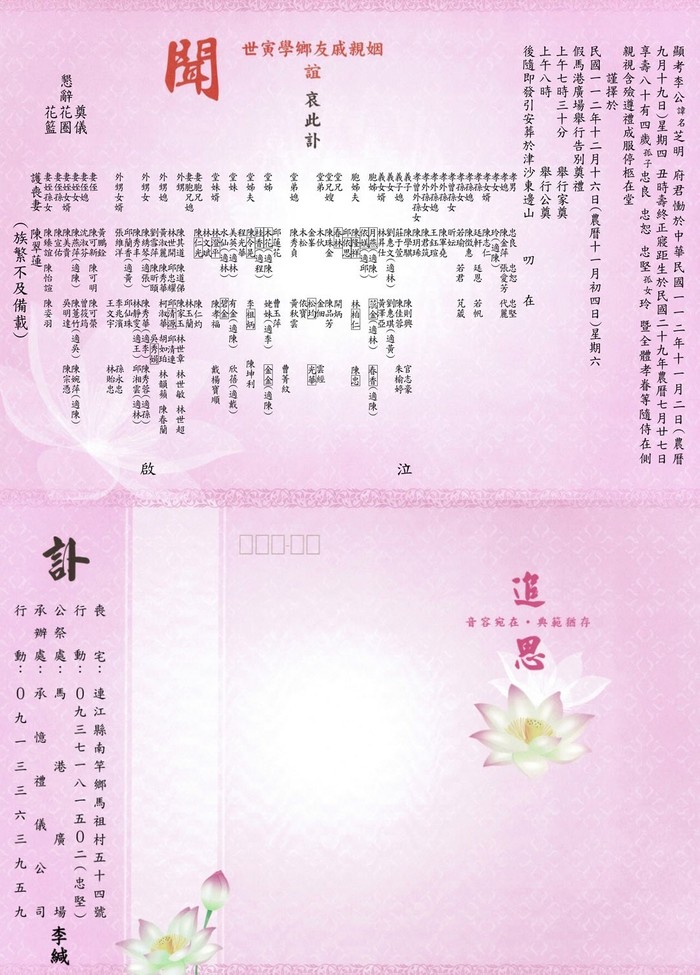 我們將在112年12月16日(星期六)早上八點,假馬港廣場為父親舉行告別奠禮,讓他帶著我們的祝福到另一個世界,謹藉馬祖資訊網敬告諸親朋好友。