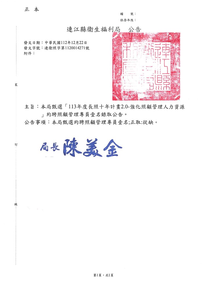 本局招募長期照顧管理中心約聘照顧管理專員錄取公告