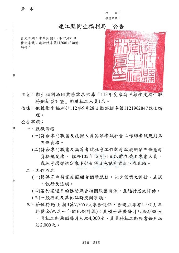 本局招募家照者創新計劃約用社工人員1名公告