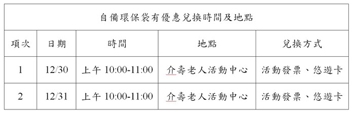 鄉親憑消費發票折抵採購物品總價3%之消費額度,以悠遊卡點數回饋方式辦理,每次消費發票回饋上限不得超過200元,至店家購物消費「自備環保袋享優惠」至112年12月30日止,憑發票折抵兌換至112年12月31早上11點止,目前已完成8場次兌換,最後兩場次將於112年12月30日與31日上午10:00-11:00假介壽老人活動中心門口憑活動發票、悠遊卡、身分證來至現場兌換,15萬點數兌換儲值悠遊卡金額,數量有限換完為止。