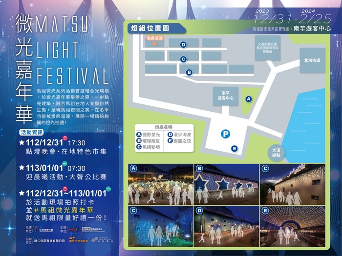 本次燈光展演將從2023/12/31持續至2024/2/25,每日17:30-21:30,以五種型態與在地人文自然結合的光環境呈現,有大坵島梅花鹿搭配藍白燈海的「鹿野星光」、呼應維護螢火蟲及無暇夜空的「璀璨耀星」、於閒置軍舍屋頂上呈現 MATSU 的「馬祖秘境」、如白浪拍打上岸為設計概念的「漫步海波」、將北海坑道與藍眼淚結合如同家家戶戶燈光般溫暖的「團圓之夜」,將馬祖特色化為燈光,相信將帶給民眾及遊客耳目一新的感受。