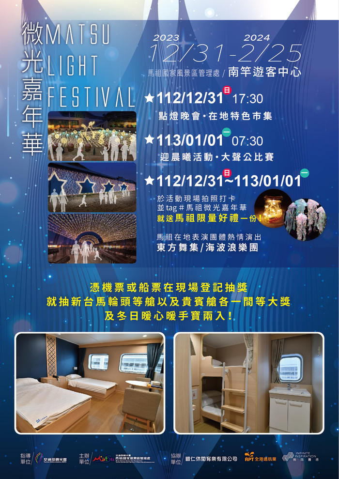 另外,2023/12/31及2024/1/1活動期間,憑機票或船票在現場登記抽獎,有機會抱走新臺馬輪頭等艙以及貴賓艙來回船票各1張的大獎!快分享給身邊親朋好友,馬祖微光嘉年華、迎晨曦活動,好禮獎不完!更多活動資訊請參閱「馬祖國家風景管理處」官網或臉書粉絲專頁。