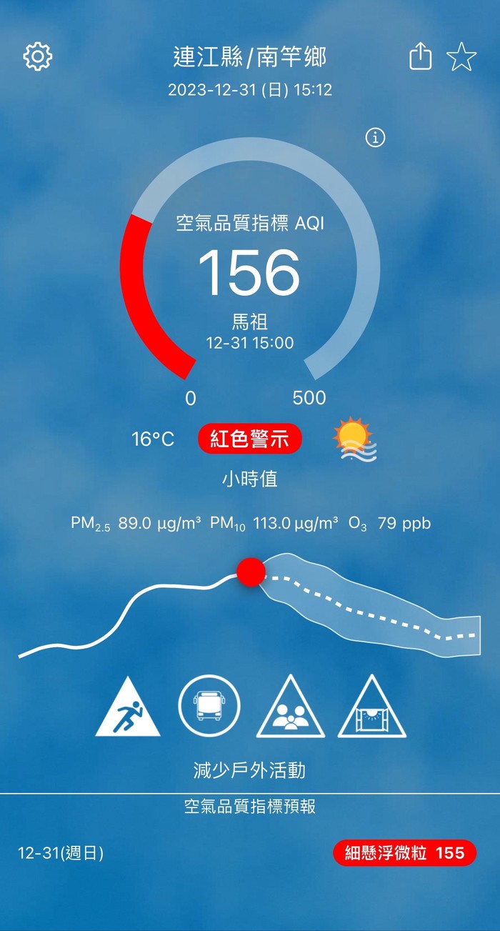 下午15時空氣品質監測結果,馬祖地區受境外污染物影響,空氣品質指標AQI為156,對所有族群不健康。另外,本縣設有PM2.5微型感測器,若民眾想了解周遭空氣品質,可至以下位址查詢。