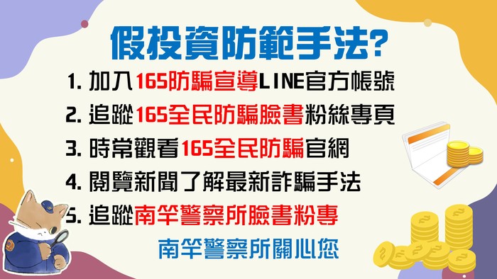 (三)165全民防騙官網及臉書粉絲專頁每週公布投資詐騙網站,並可至投信投顧公會網站(https://reurl.cc/a953KZ)查詢合法投資管道。