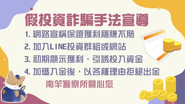 (一)網路(FB、IG、Y2B)看到投資、輕鬆賺錢貼文,或在交友網站、交友軟體(APP)認識網友,網友慫恿投資,以掌握「平臺漏洞、後臺程式」等話術,宣稱保證獲利、穩賺不賠且利潤豐厚。