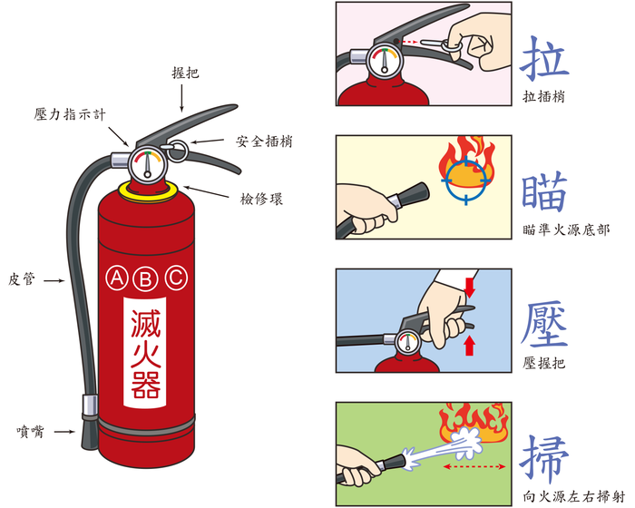 在滅火器功能正常的前提下,還可能因為滅火器的插梢沒有拔出來、或是把手沒有壓到底......等等原因,導至乾粉無法噴出。正確操作滅火器才能發揮它的功能,才可能抑制初期火災;以下簡單的滅火器操作口訣一定要記得並且多練習,滅火器簡易的檢測方法也要仔細了解喔!