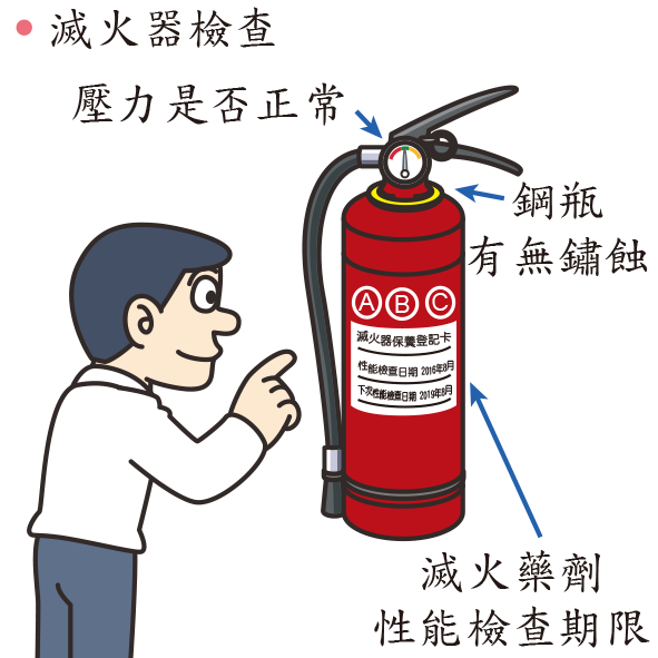 一、滅火器基本檢查項目有壓力表、鋼瓶及軟管外觀以及滅火藥劑檢查日期等:
