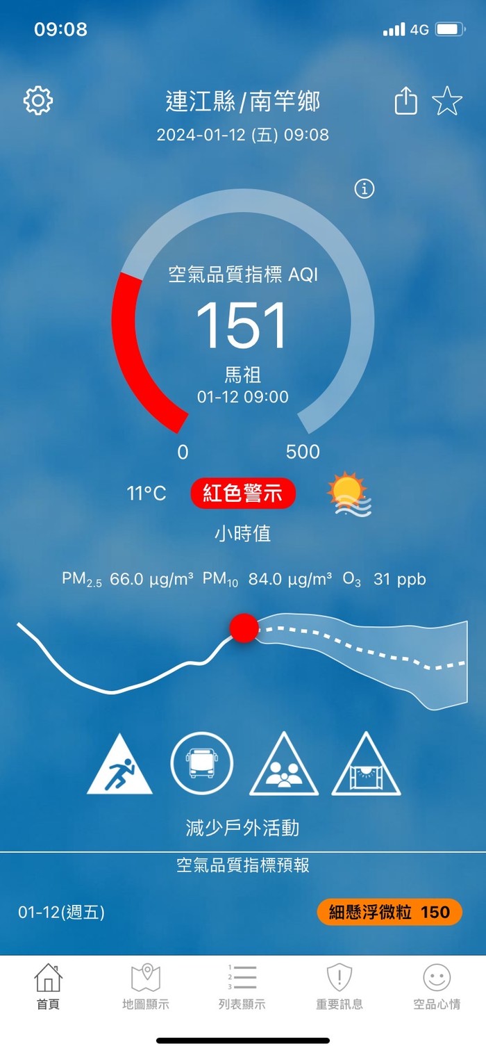 上午9時空氣品質監測結果,馬祖地區受境外污染物影響,空氣品質指標AQI為151,對所有族群不健康。