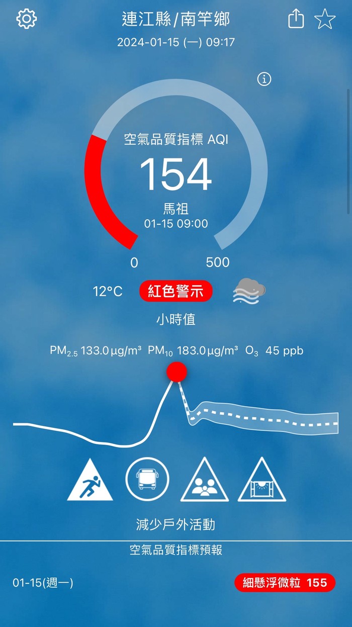 上午9時空氣品質監測結果,馬祖地區受境外污染物影響,空氣品質指標AQI為154,對所有族群不健康。