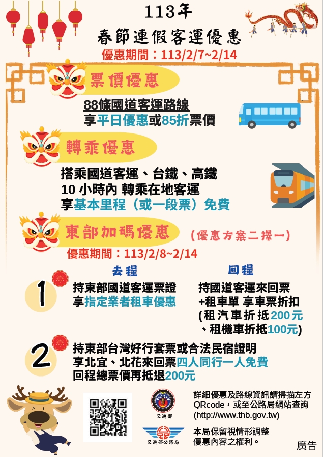 為了鼓勵民眾多家利用大眾運輸工具,公路局自連假前一日113年2月7日0時起至113年2月14日24時止推出多項全國性共通國道(公路)客運優惠,提供返鄉及出遊旅客選擇,包括客運業者實施88條中長途國道客運路線享平日票價或原票價85折優惠。另外在轉乘優惠部分,舉凡搭乘高鐵、臺鐵及國道客運後10小時內使用電子票證轉乘在地客運均可享有1段票(或基本里程)免費優惠。另外針對前往臺灣東部區域民眾,享有「在地有腳」租賃優惠,搭乘指定東部國道客運路線享租車優惠,回程持租賃汽機車憑證享國道客運車票優惠(租汽車者折抵200元,租機車者折抵100元),而持東部合法旅宿業住宿憑證或台灣好行套票,搭乘東部國道客運享4人同行1人免費,回程再折抵200元。(與在地有腳租賃優惠擇一使用)