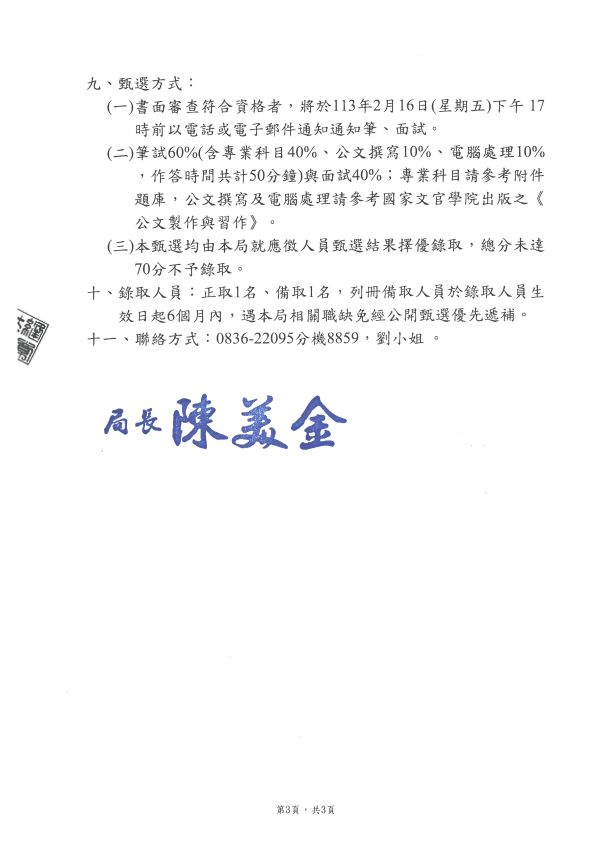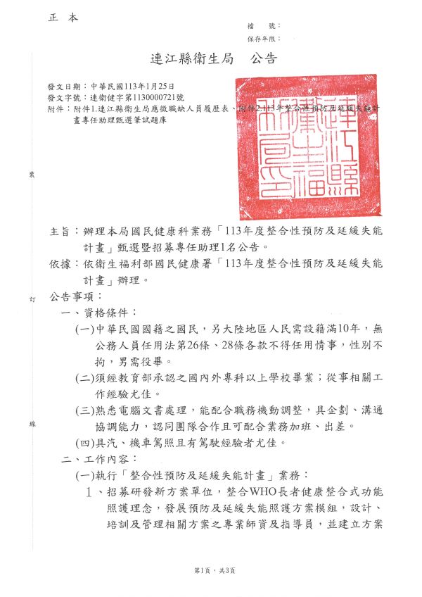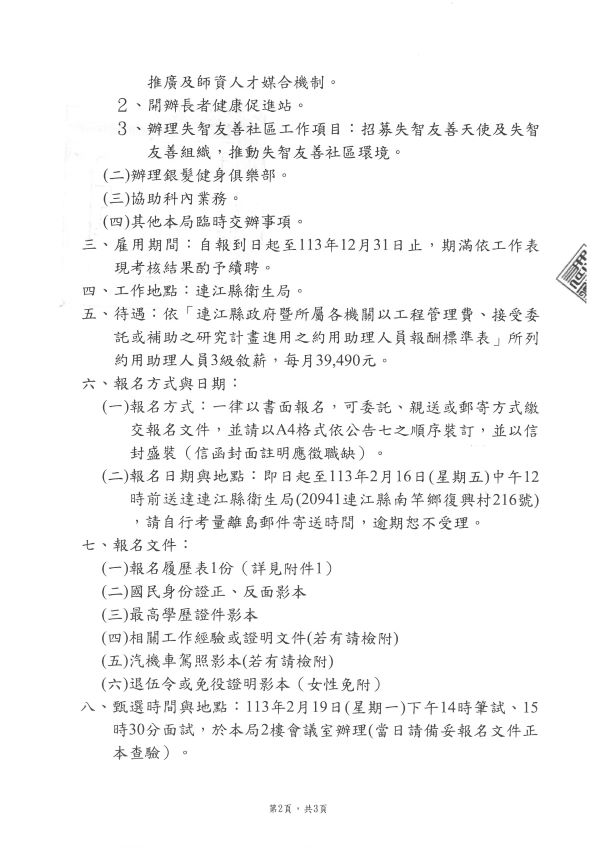 本縣衛生局國民健康科甄選專任助理1名公告