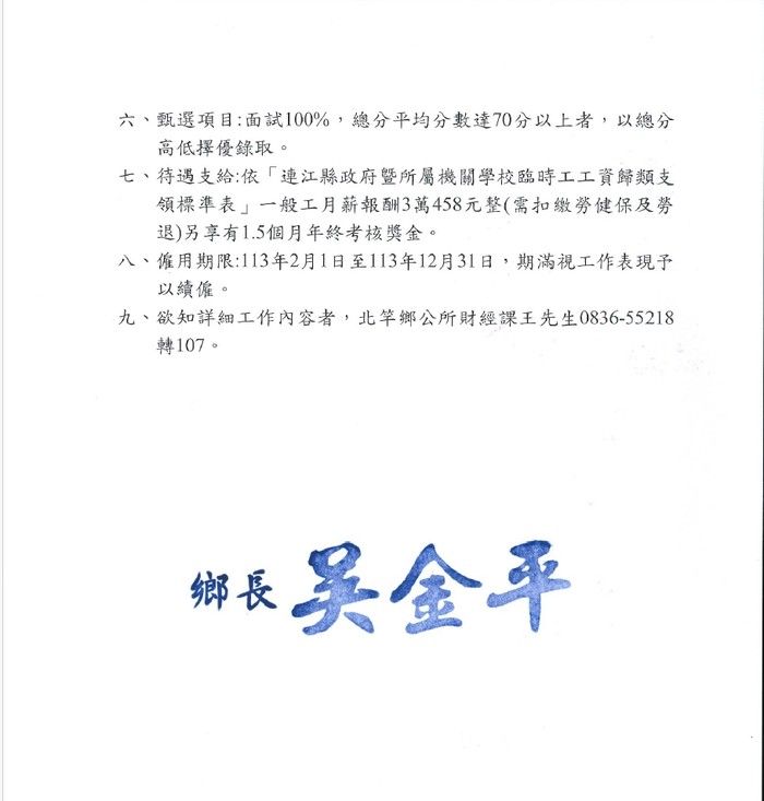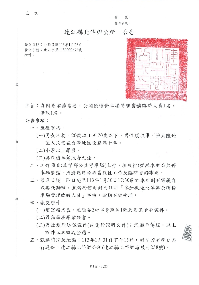 北竿鄉公所公開甄選停車場管理業務臨時人員1名