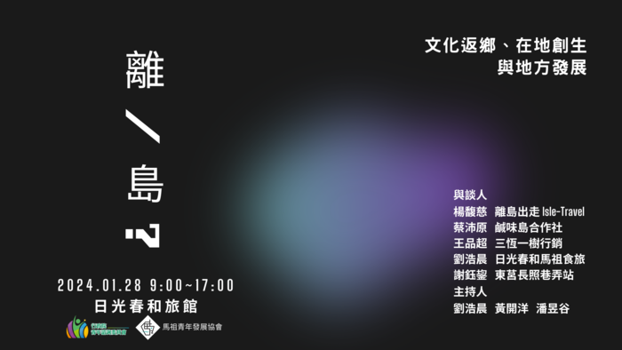 活動講者:楊馥慈(離島出走isle.travel)、蔡沛原(鹹味島合作社)、王品超(三恆一樹行銷)、劉浩晨(日光春和馬祖)、謝鈺鋆(東莒長照巷弄站)