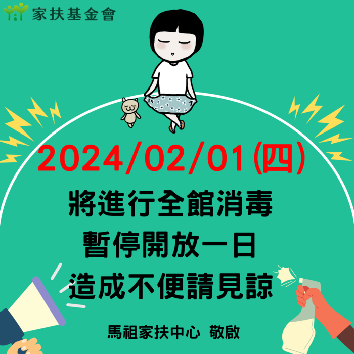 2024/02/01(四),馬祖家扶中心將進行全館消毒,暫停開放一日,造成不便請見諒。