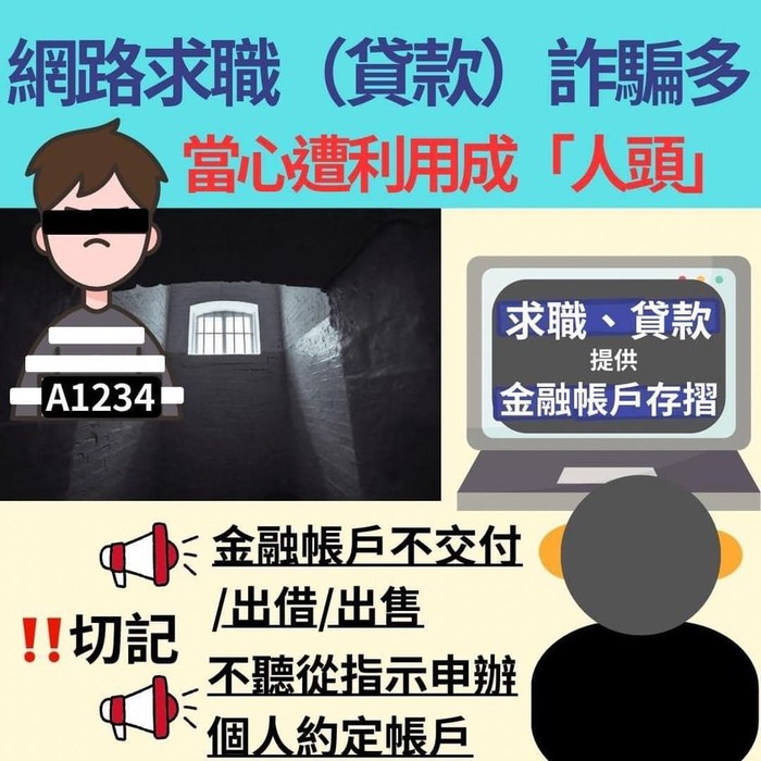 🔔民眾切勿任意將自己或他人帳戶.帳號交給來路不明人士.以免觸法。