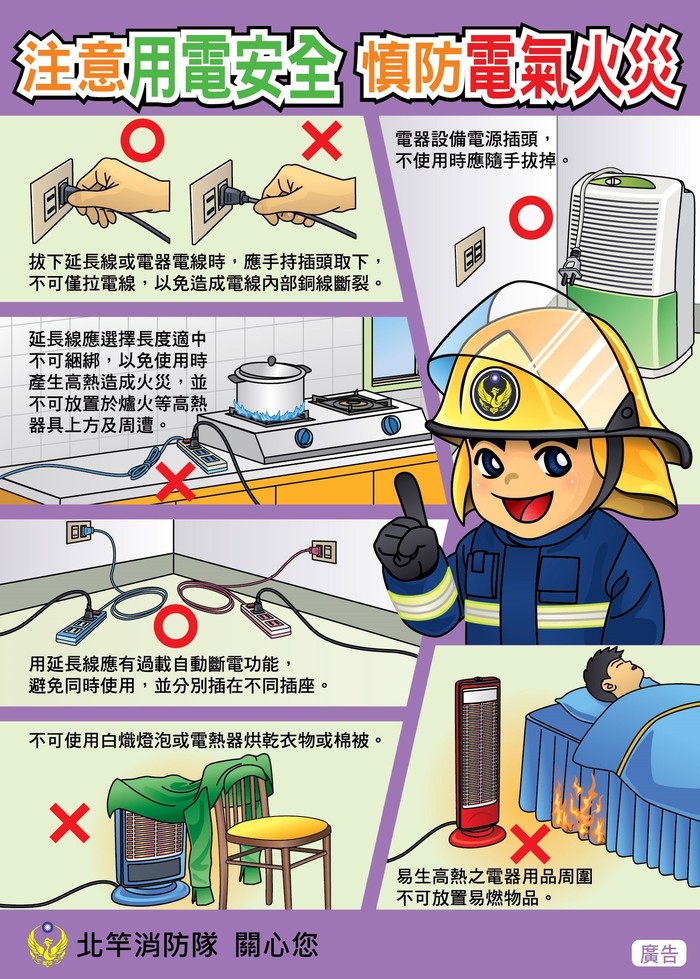 北竿消防隊宣導用火用電安全事項 --閱讀人次 : 567 春節期間間天氣寒冷,⽤火及⽤電量增加,請各位鄉親⼀定要注意⽤火、⽤電安全事項: