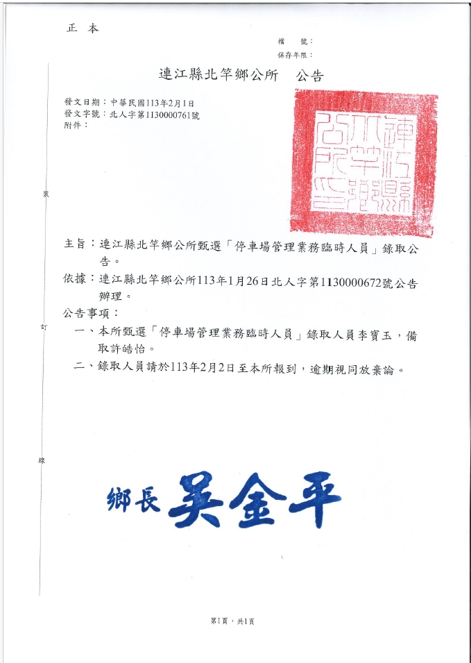 北竿鄉公所停車管理業務臨時人員錄取公告