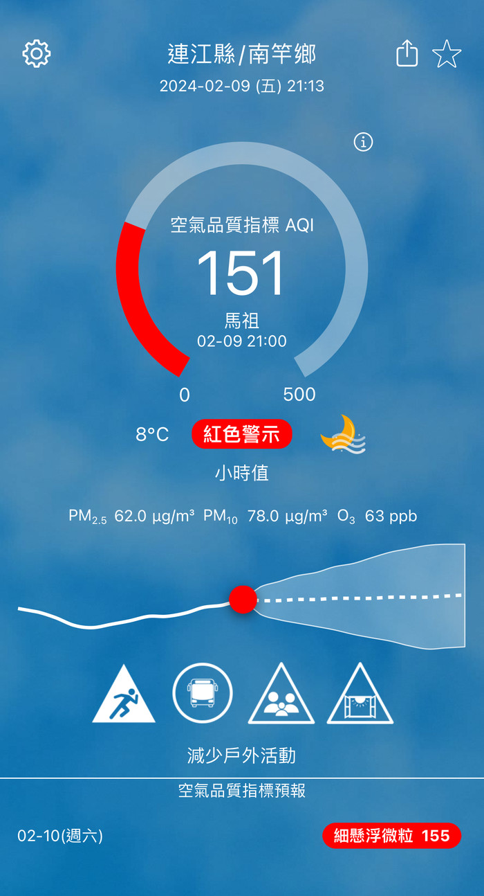 下午21時空氣品質監測結果,馬祖地區受境外污染物影響,空氣品質指標AQI為151,對所有族群不健康。