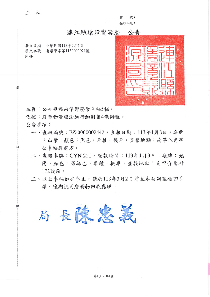 主旨:公告查報南竿鄉廢棄車輛2輛。