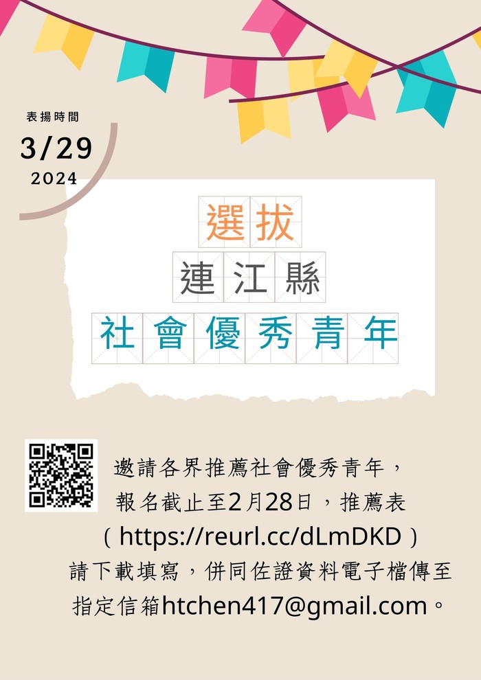 慶祝中華民國113年青年節,縣府教育處辦理社會暨學校優秀青年遴選及表揚活動,藉資表揚其優良德行及傑出事蹟,並鼓勵青年奮發向上,成為社會大眾學習模範。推薦報名至2月28日,推薦表(https://reurl.cc/dLmDKD)請下載填寫,併同佐證資料電子檔傳至指定信箱htchen417@gmail.com。