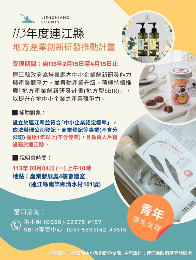 113年度連江縣地方型SBIR徵件自2月15日起至4月15日,歡迎踴躍投件。