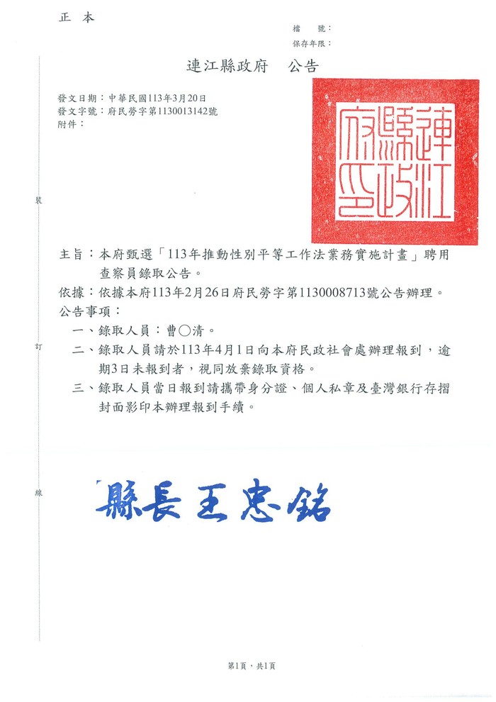 民政社會處性別平等工作法業務聘用人員錄取公告
