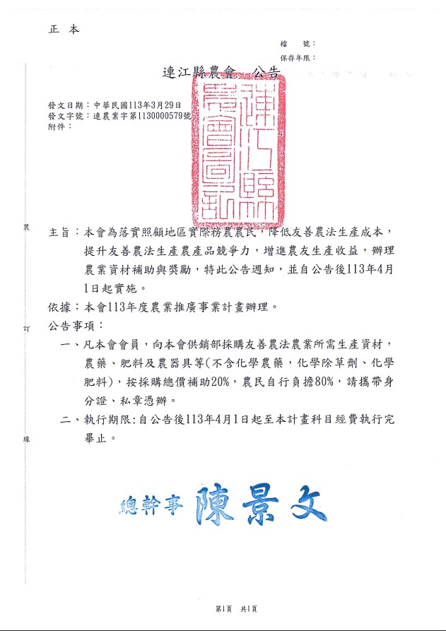 本會為落實照顧地區實際務農農民,降低友善農法生產成本,提升友善農法生產農產品競爭力,增進農友生產收益,辦理農業資材補助與獎勵,特此公告周知,並自公告後113年4月1日起實施。