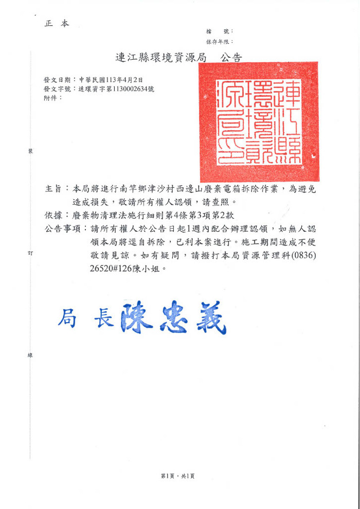 環資局將進行南竿鄉津沙村西邊山廢棄電箱拆除作業,為避免造成損失,敬請所有人認領。請所有權人於公告日起1週內配合辦理認領,如無人認領本局將逕自拆除,以利本案進行。施工期間造成不便敬請見諒。如有疑問,請於上班時間撥打本局資源管理科(0836)26520#126陳小姐。