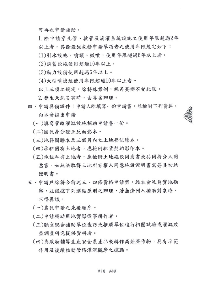 擴大灌溉設施申請補助 --閱讀人次 : 544 因補助金額還有剩餘額,請有需求之農友至本會辦理申請相關事宜。