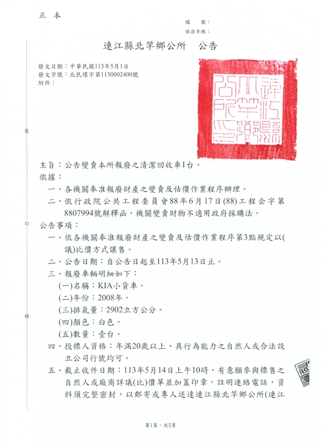 北竿鄉公所報廢清潔回收車變賣公告