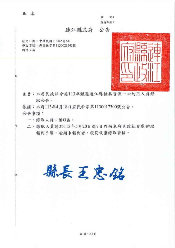 連江縣政府民政社會處錄取公告