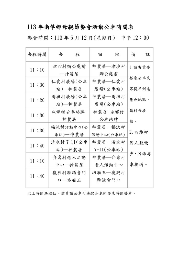 餐會舉辦場地為坊廂玉餐廳(復興村)及神辳居婚宴會館(介壽村、福沃村、清水村、珠螺村、馬祖村、四維村、津沙村、仁愛村與素食鄉親),誠摯邀請設籍在南竿鄉的媽媽們共同參加。