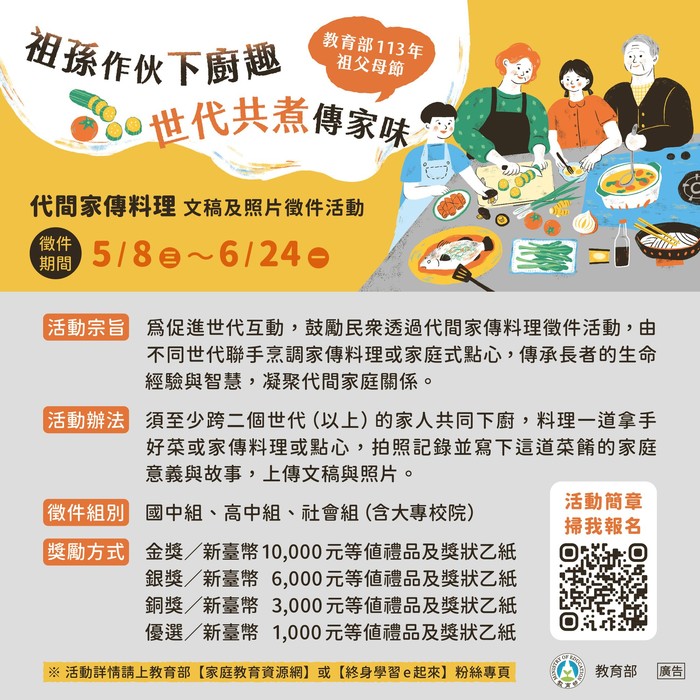 祖孫作伙下廚趣 世代共煮傳家味 --閱讀人次 : 965 教育部113年 代間家傳料理文稿及照片徵件活動 開跑囉