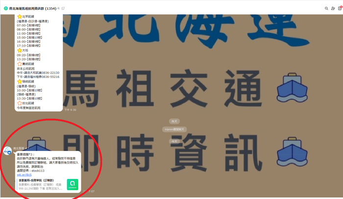 小心詐騙在LINE假名稱邀請加投資群 --閱讀人次 : 926 特別提醒大家小心詐騙集團在本地一些重要的交通及通知等LINE群組內,用類似的LINE名稱假冒別人名稱,邀請加投資群組,以下提供案例一則,下圖紅圈部分就是詐騙者的訊息,北竿警察所關心您~