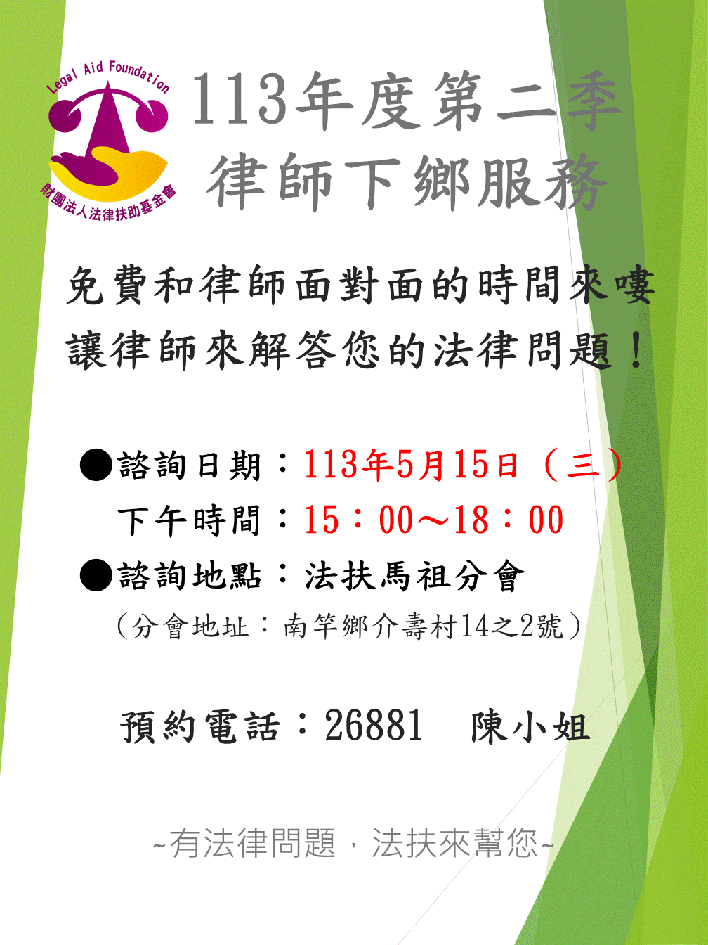 各位鄉親好,法扶會通知本週三下午,分會有現場和律師免費法律諮詢喔,有法律需求的民眾,敬請來電預約,其他東引、莒光或北竿鄉親亦可來電預約,律師會親自播打電話為您服務喔~