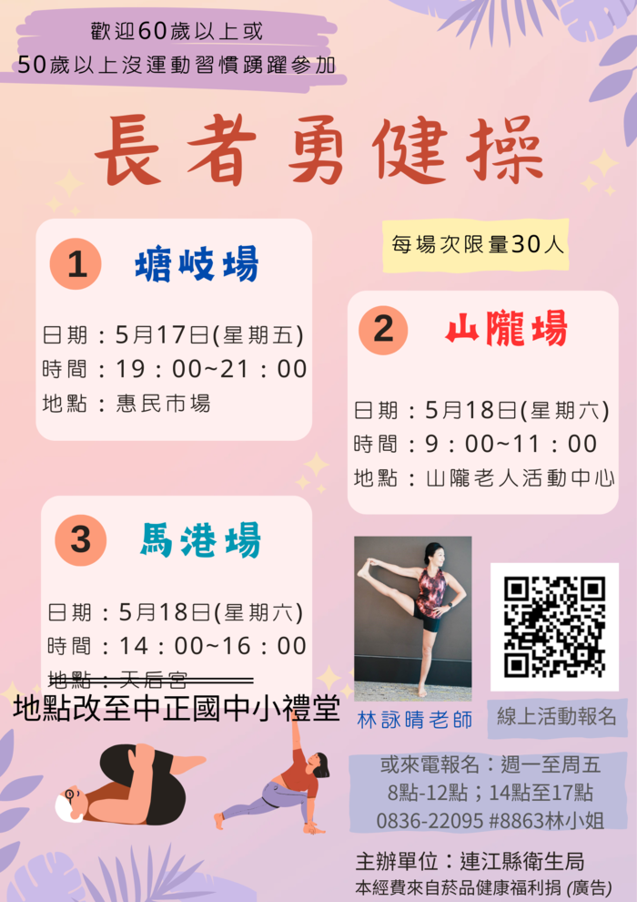 長者勇健操5/18下午馬港場地點更改為中正國中小禮堂