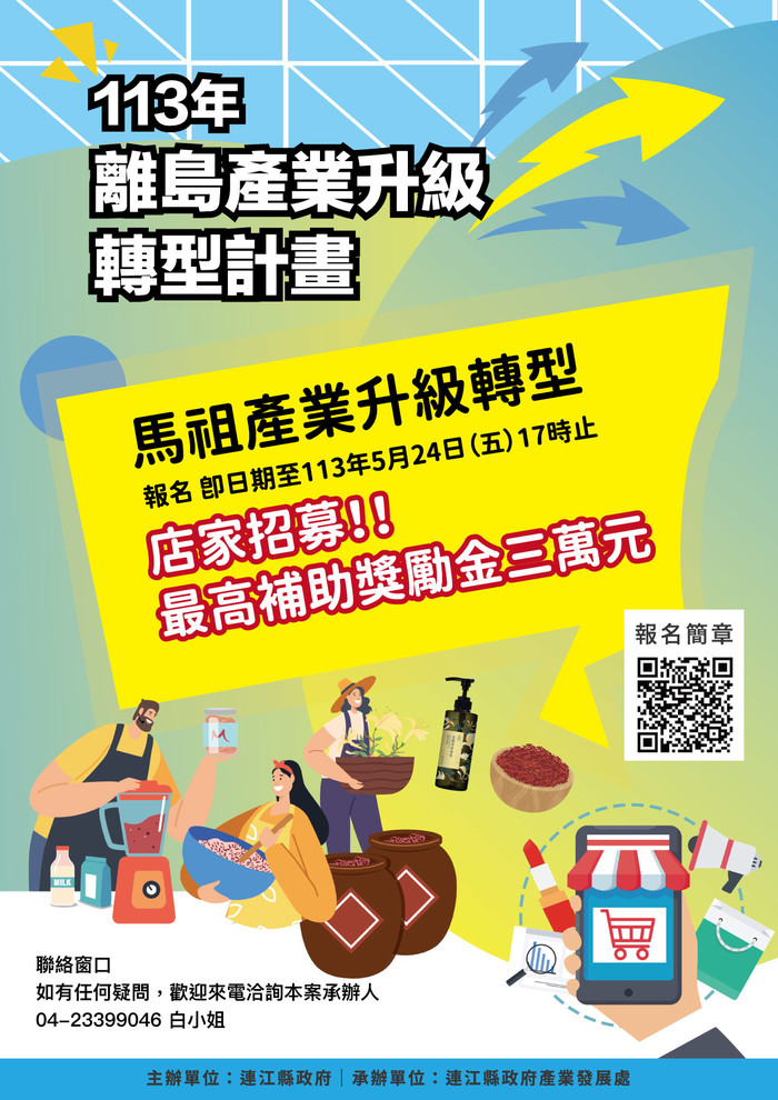 馬祖地方品牌蛻變 產業升級好時機 --閱讀人次 : 984 馬祖產業升級轉型招募在地業者!最高補助金額3萬元,報名截止至113年5月24日(五)。連江縣政府誠摯邀請縣內公司、行號,以及具有地方特色的店家踴躍報名共同參與,攜手打造馬祖品牌形象,再創馬祖經濟新亮點!