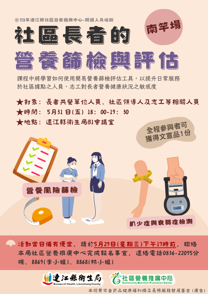藉由營養風險篩檢之評估工具,暸解如何評估長者的營養狀況,正確使用篩檢工具,掌握社區長者的初步營養狀況,以提升社區據點人員、志工營養相關照護敏感度,並深入社區協助發現可能具有營養問題的高齡長者。