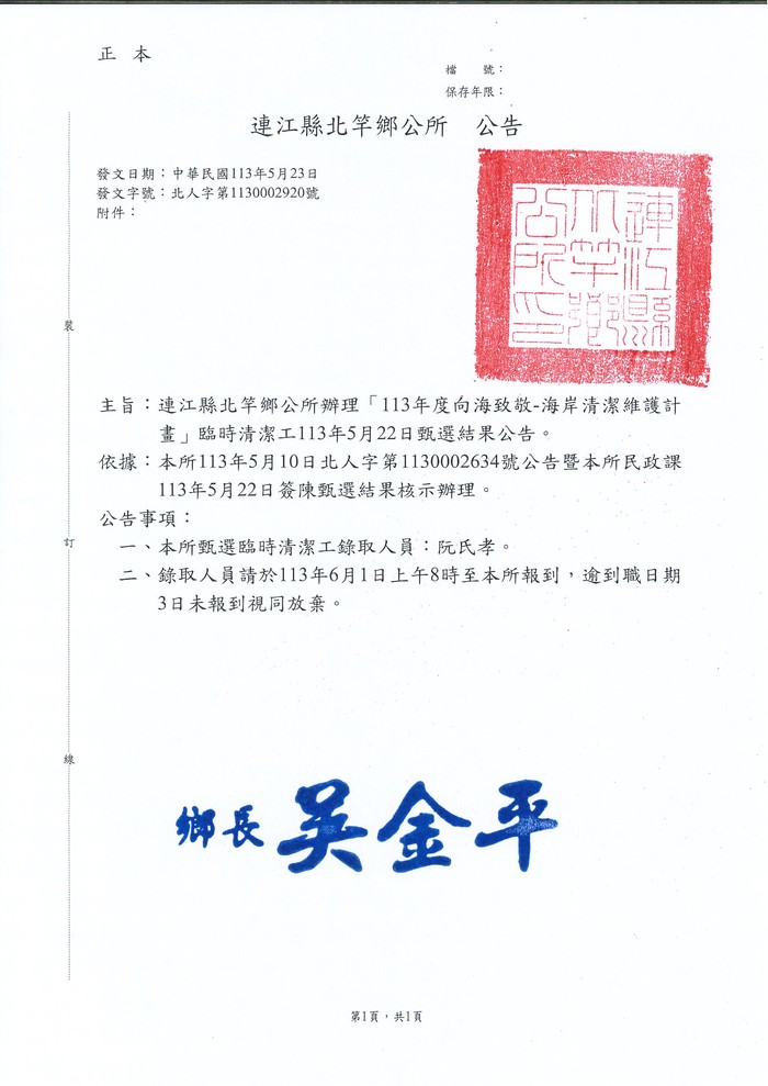 北竿鄉公所甄選向海致敬海岸清潔維護計畫臨時清潔工甄選結果公告