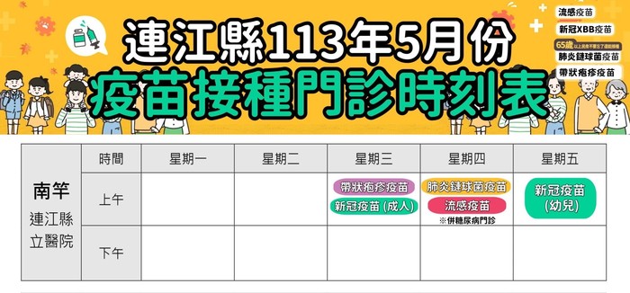 連江縣立醫院5月份疫苗接種門診時間表