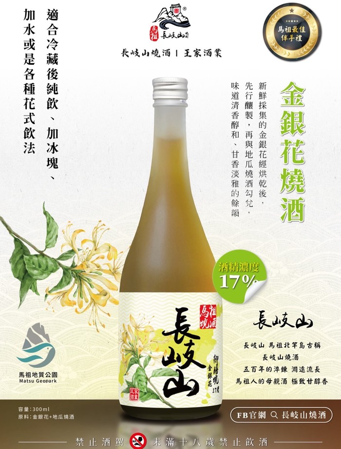 金銀花是馬祖的守護花,馬祖四鄉五島皆豐產.數百年來馬祖先民常以金銀花曬乾來佐飲:夏飲冬補.不僅清熱解毒、消炎降血壓、更能解酒清腦、消脂美容及祛痘美顏.金銀花是馬祖老祖先長期以來"草本智慧"的精粹.長岐山燒酒秉承燒酒文化傳承與創新理念,將馬祖居民守護花研發入酒,期許讓祖先的智慧流芳百世!