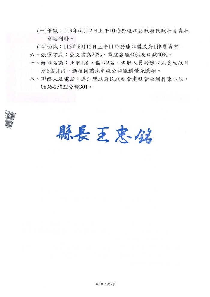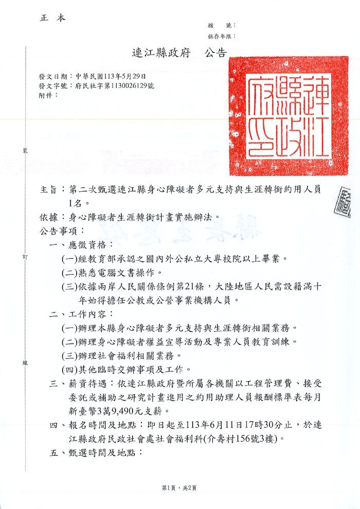 民社處甄選連江縣身心障礙者多元支持與生涯轉銜約用人員1名公告