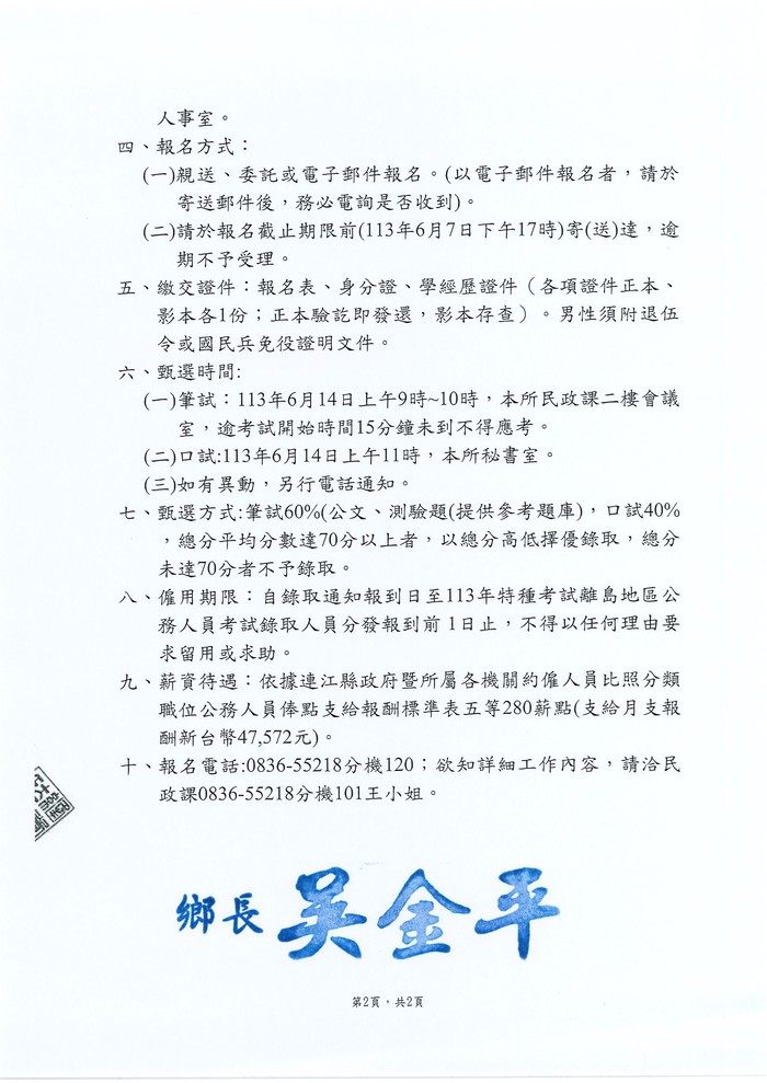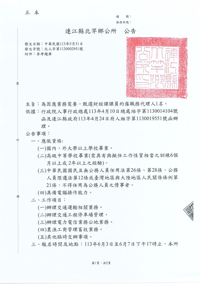 北竿鄉公所甄選財經課課員約僱職務代理人公告
