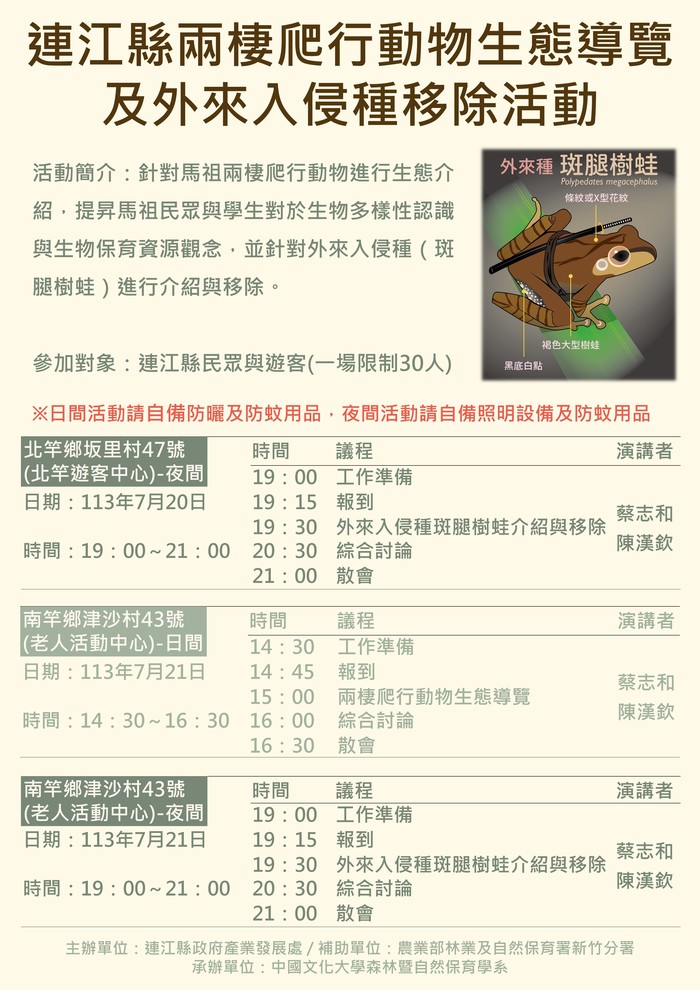 兩棲生態宣導及外來種移除活動錄取公告 --閱讀人次 : 798 各位知道馬祖有哪些兩棲爬行動物嗎?是否曾在哪個小角落發現牠們呢?這次讓我們一起近距離觀察牠們吧!本年度另增加移除外來種唷!