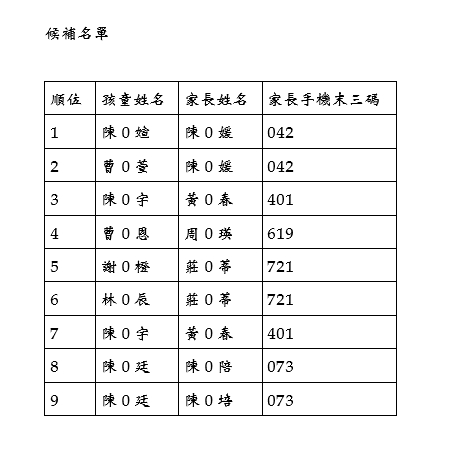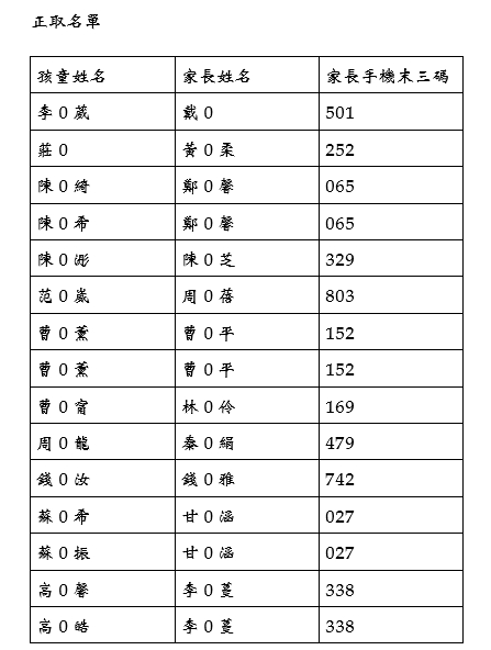 3.若以下正取名單之參與孩童,有無法參加者,請於7月20日(六)前致電通知中心工作人員,以利後續安排候補名單學童參加。