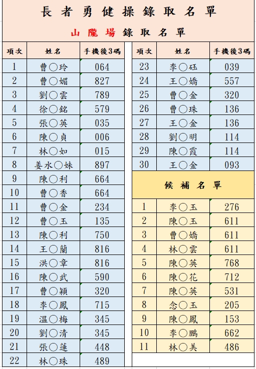 長者勇健操錄取公告